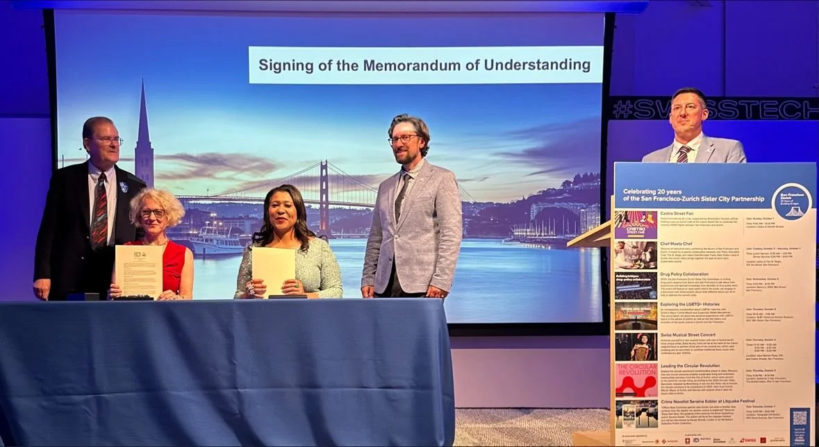 Signing of the MOU extending the Sister City Partnership between San Francisco and Zürich by Mayors London Breed and Corine Mauch in the presence of the Co-Chairs of the Sister City Committee Gianmatteo Costanza and James Bridgeman and Consul General of Switzerland Balz Abplanalp and celebrating the 20th anniversary of the Sister City relationship at Swissnex in San Francisco.